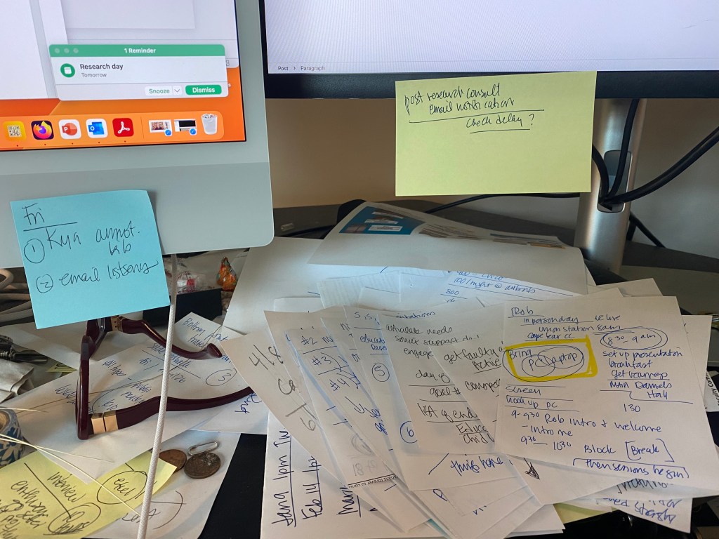 Here’s a look at my desk, littered with scrap paper on which I jotted notes (thanks to my ADHD brain). Didn’t note the source of the article I read that spurred the following thoughts on sustainability and swag.